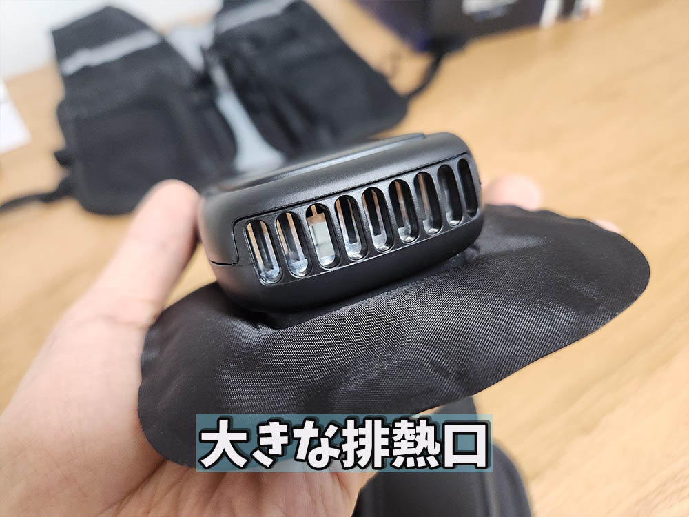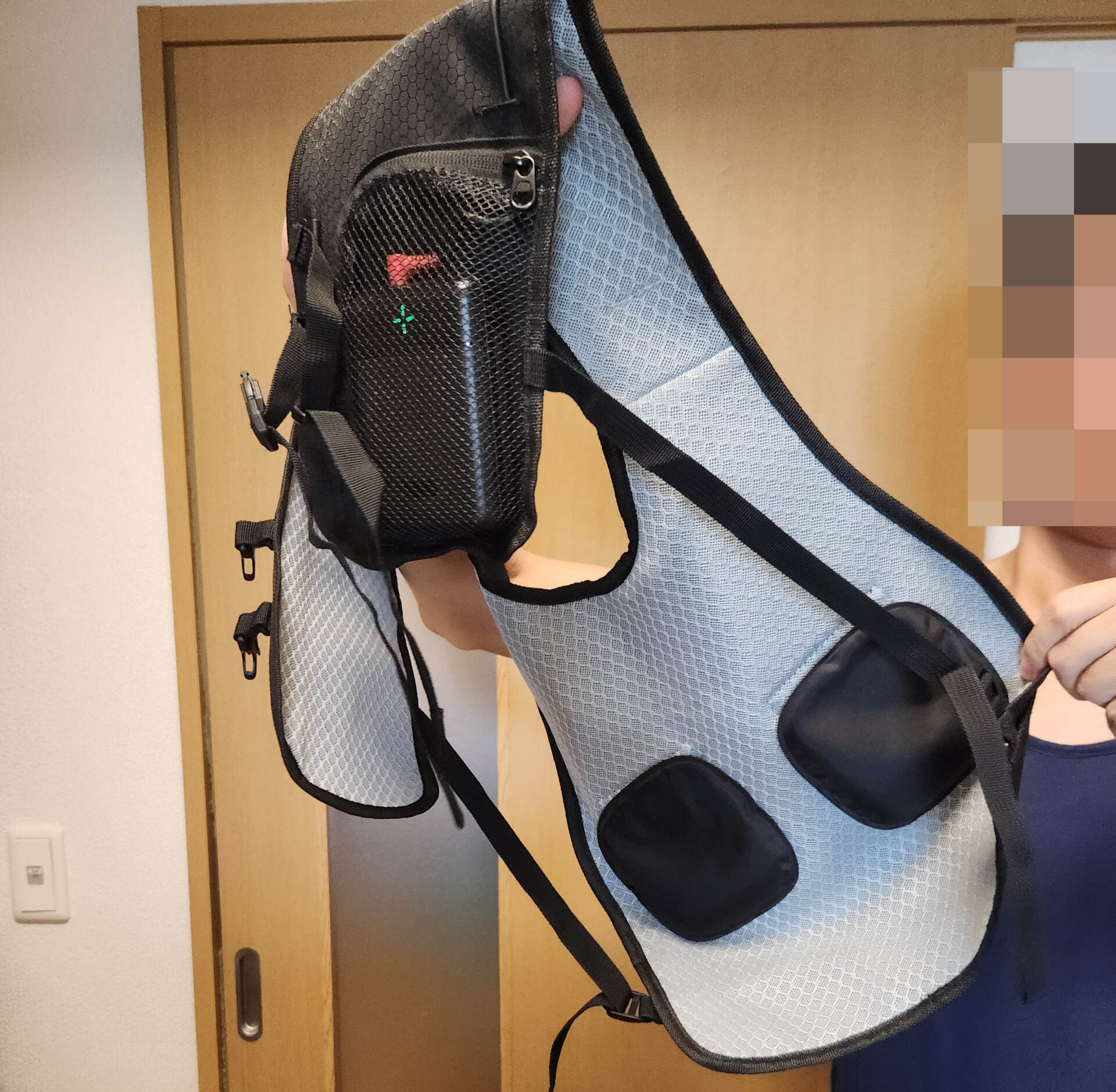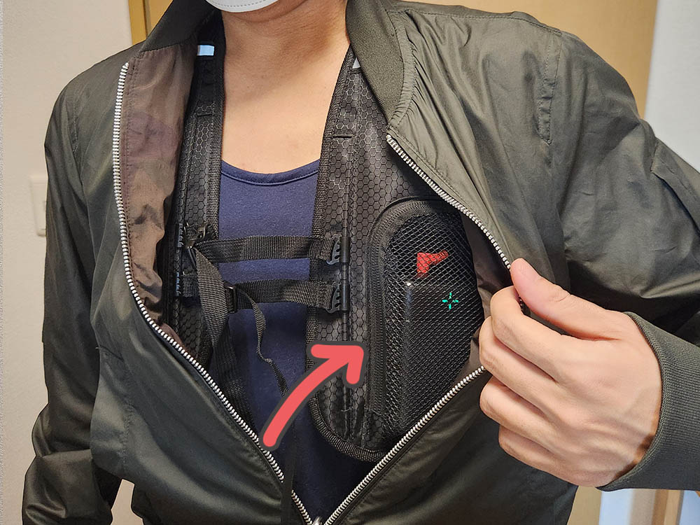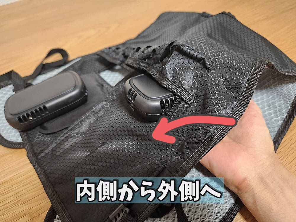 こちらに関しては、ポケットのようなものがあるわけではありませんが、冷却パッドがベストの内側、機械部分がベストの外側にくる構造になっていて、その段差でうまく引っかかって固定されるような仕組みになっています。