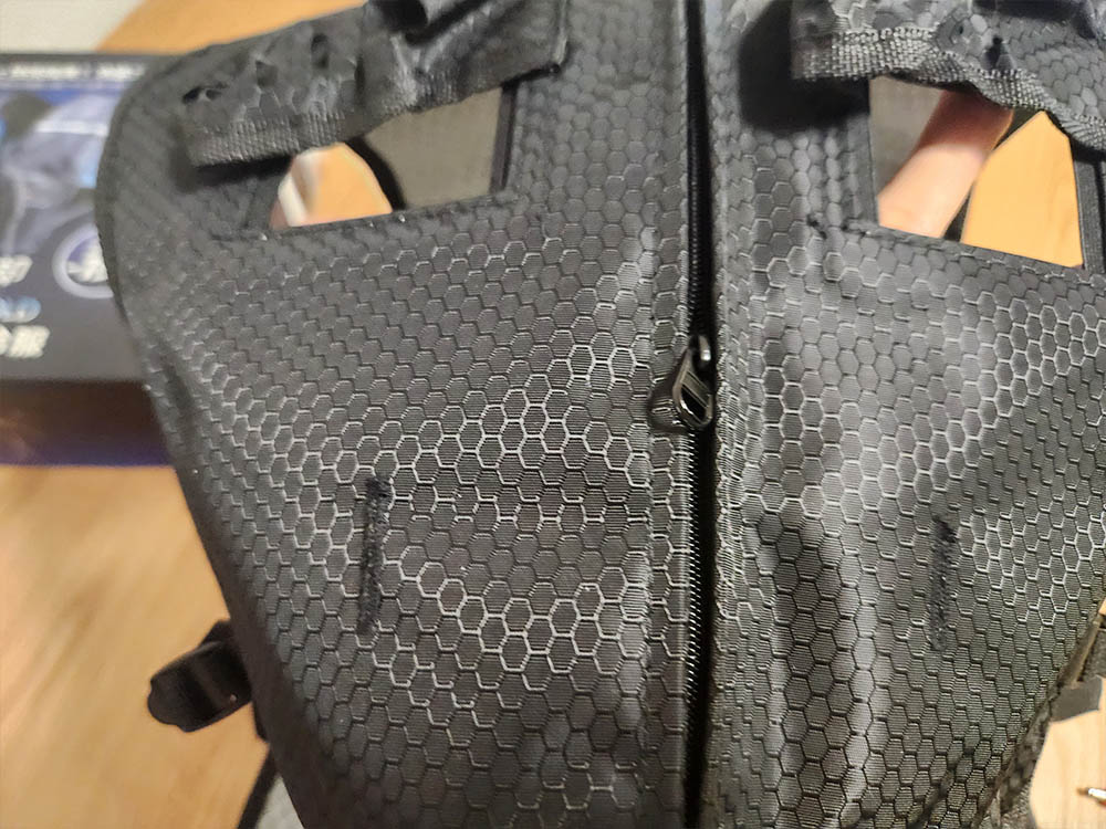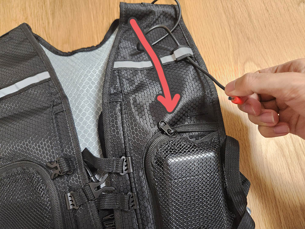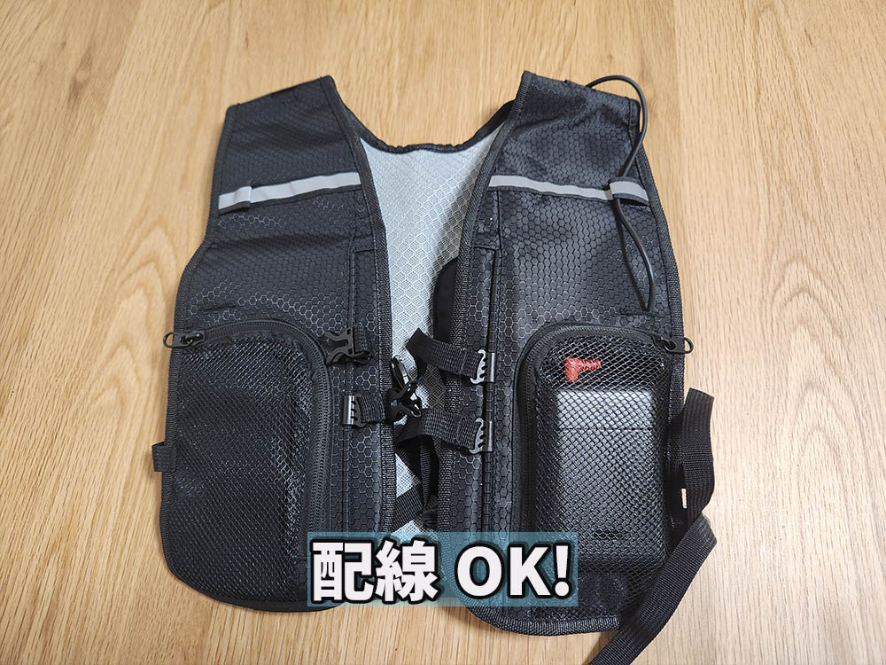 ケーブルに関しては、背面中央にチャックがあり、ベストの内側を通して表に出せるような構造になっています。