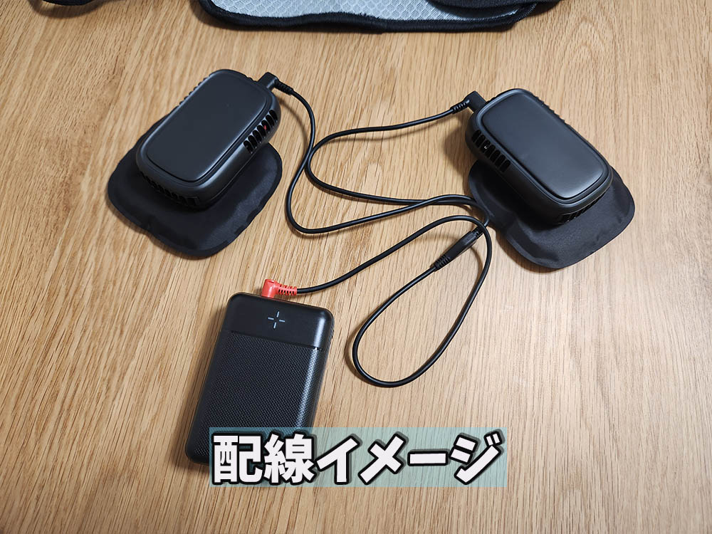 配線のイメージとしては、こんな感じでバッテリーからペルチェ式の冷却パッドにケーブルをつないでいきます。