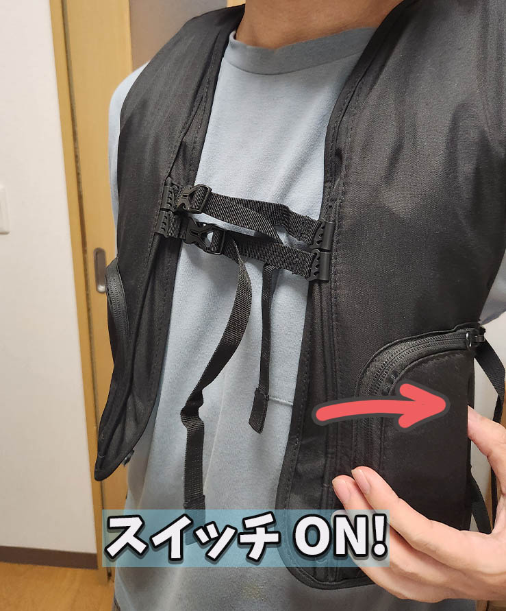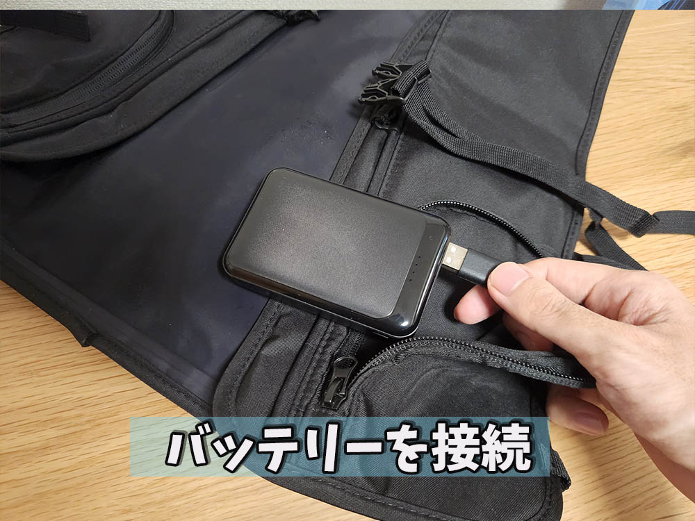 あとはバッテリーをウェア左ポケットのケーブルに接続すれば用意完了です。