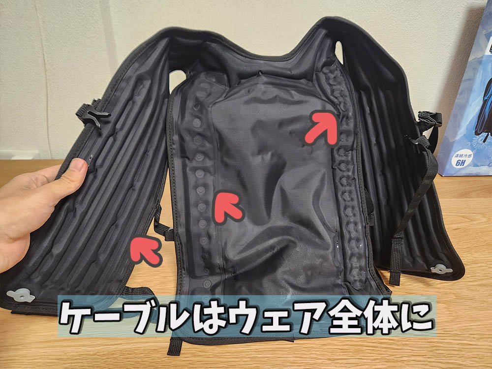 こんな感じで背中の下の方から胸の表側背中側と、体の熱くなる部分を広く水チューブがカバーしています。