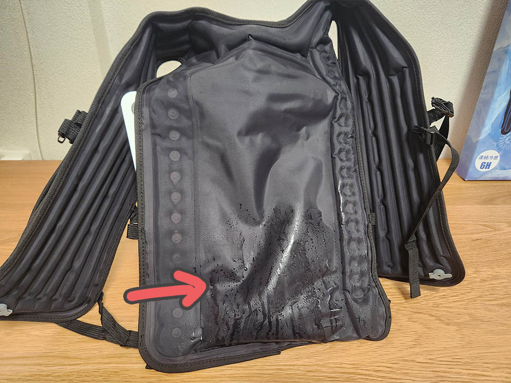 保冷剤をいれた水はとても冷たいので、ウェアを10分ぐらい着用した段階でこんなに結露がついていました。