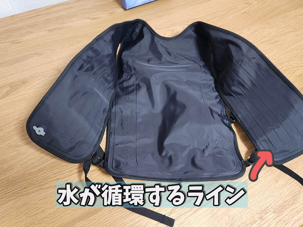 ウェアに内蔵されたチューブを伝って冷水が全体にいきわたり体を冷やします。感覚的にはアイスノンを背中に当てているような感じです。