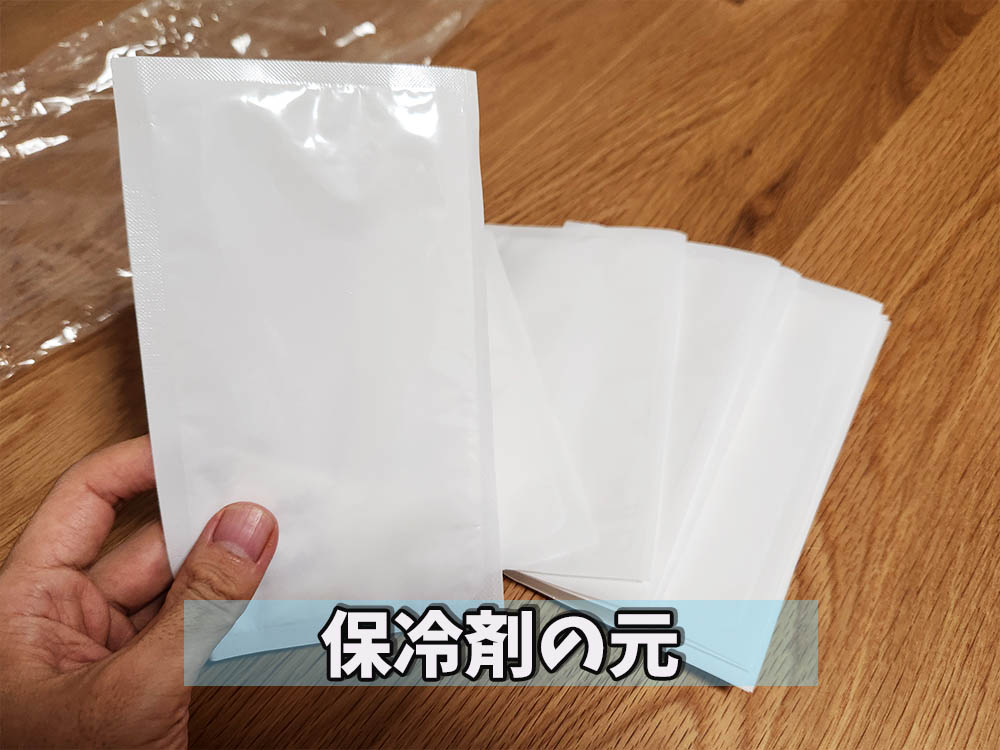 最初はサラサラの粉がはいったふくろですが、これを水につけることで見慣れた保冷材の姿になります。