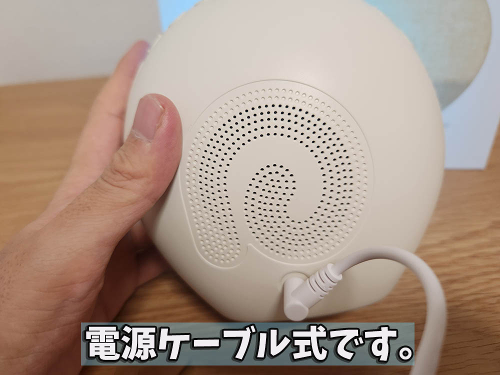 雰囲気作りが大事な入眠とホワイトノイズマシーンにおいてこの光をコントロールする機能はかなり効果的なのですが、一方で消費電力が上がってしまうため電源ケーブルの接続が必要になります