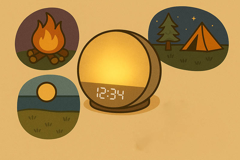 ホワイトノイズマシンには森林や焚火などシチュエーションを演出するようなサウンドも多いため、それに合った照明をつけると没入感は一層増します。