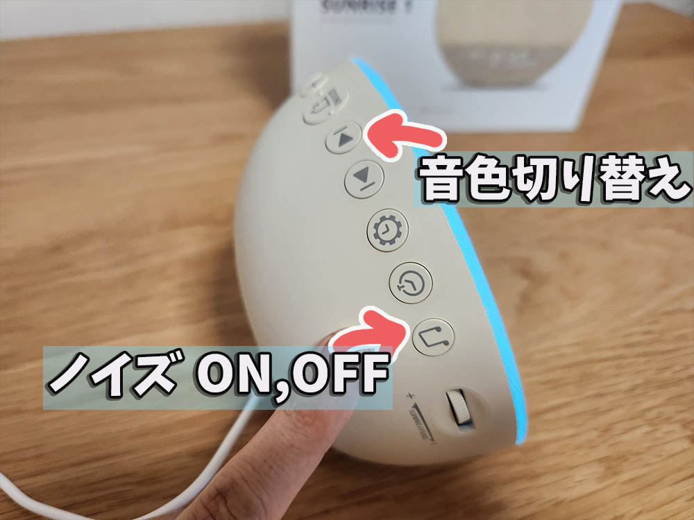 そして反対側の音符ボタンでホワイトノイズをON,上部の左右ボタンで再生音声の切り替えです